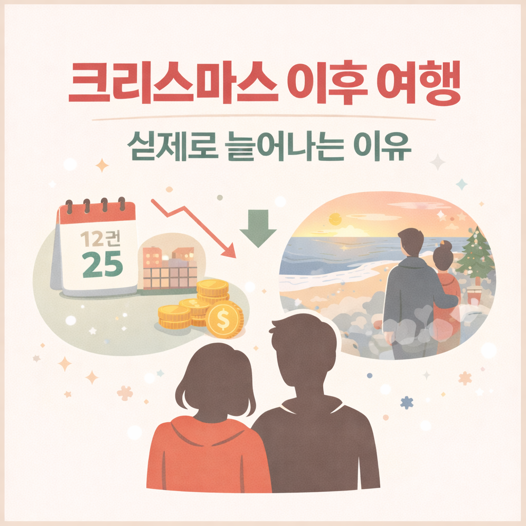 “크리스마스 지나고 여행 가는 사람이 더 많다는 사실, 의외죠?”대부분은 크리스마스가 지나면 여행 시즌도 끝났다고 생각합니다. 하지만 실제로는 크리스마스 이후 여행을 선택하는 사람들이 해마다 눈에 띄게 늘어나고 있습니다.이 시기를 모르고 지나치면 같은 여행지를 더 비싸고 더 붐빌 때 다녀오게 되는 셈입니다.왜 사람들은 굳이 크리스마스가 끝난 뒤 여행을 떠날까요? 이 글에서 연말 여행 수요의 실제 흐름와 비수기 여행의 숨은 장점을 하나씩 풀어봅니다.연말 여행, 비싸게 갈 이유 없습니다크리스마스 이후 가성비 좋은 일정부터 확인해보세요 지금 바로 확인하러 가기 크리스마스 이후 여행, 실제로 늘어나는 이유기: 크리스마스 전까지는 여행 수요가 한 방향으로 몰립니다.승: 가족 모임, 연인 일정, 연말 행사 등이 ..