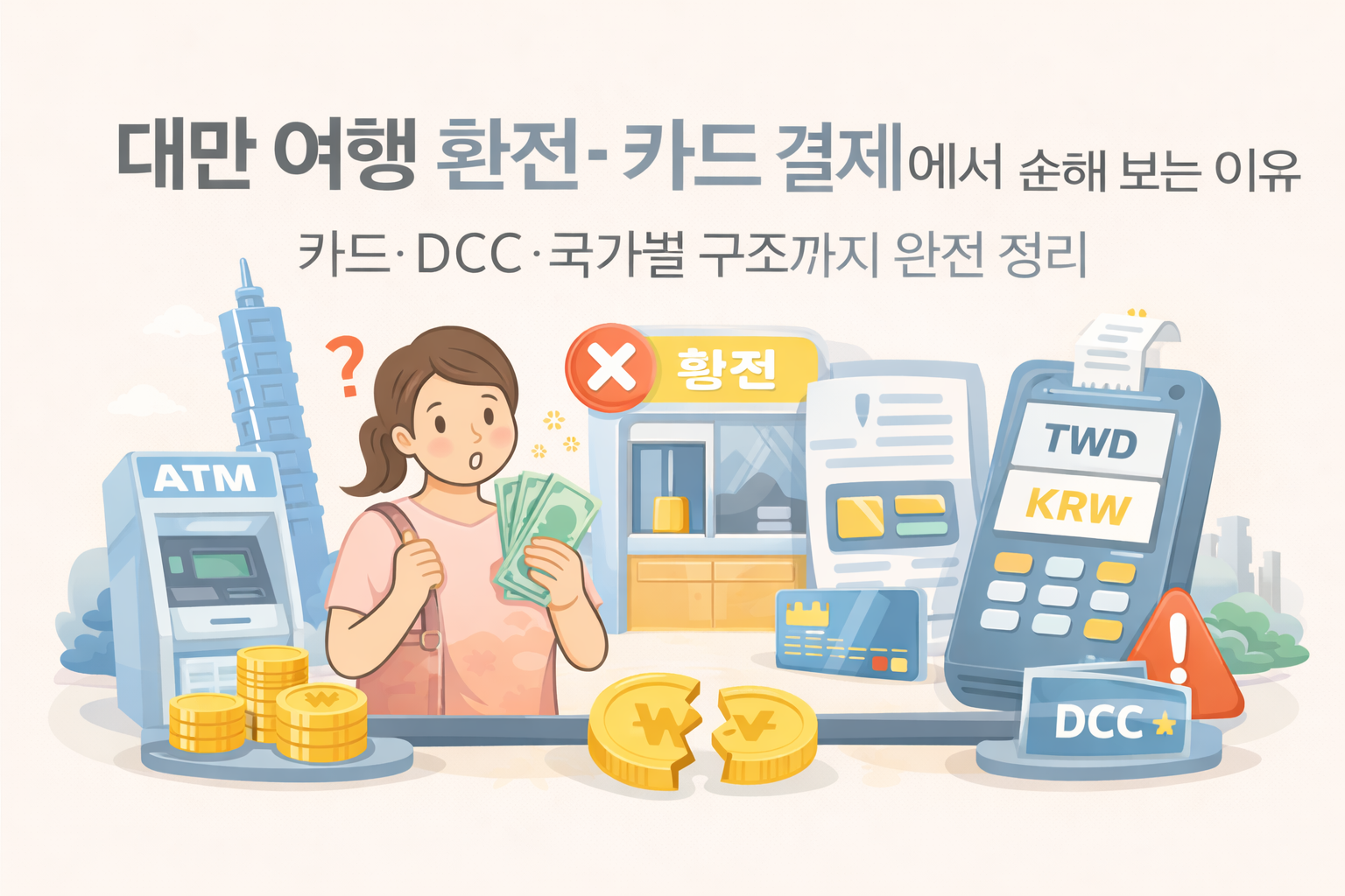 대만 여행, 환전·카드 결제에서 손해 보는 이유|카드·DCC·국가별 구조까지 완전 정리대만 여행을 다녀온 뒤 “생각보다 돈이 더 들었다”고 느끼는 경우가 많습니다. 하지만 원인은 음식이나 호텔이 아니라 환전과 카드 결제 구조에 있습니다.이 글은 여행 정보가 아니라 돈이 새는 지점을 짚는 글입니다. 같은 여행을 해도 누구는 남기고, 누구는 손해를 보는 이유를 환전·해외카드·원화결제(DCC)·국가별 결제 구조로 정리합니다.한 줄 요약대만 여행 비용 차이는 “얼마를 썼느냐”보다 어디서·어떻게 결제했느냐에서 먼저 벌어집니다. 1) 대만 환전, 공항에서 시작하면 이미 손해입니다대만 도착 직후 공항 환전은 가장 흔한 선택이지만, 환율이 불리하고 수수료가 반영된 경우가 많아 전액 환전용으로는 비효율적입니다.공항 환전..