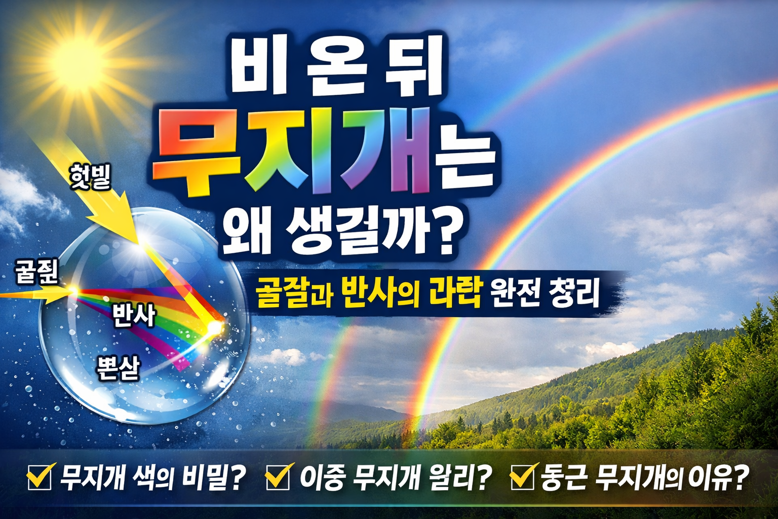 비 온 뒤 무지개는 왜 생길까? 굴절과 반사의 과학 완전 정리비가 그친 뒤 하늘에 무지개가 뜨는 이유는 단순히 “비 다음에 나타나는 예쁜 현상”이 아니라, 햇빛이 공기 중 물방울을 통과하면서 굴절되고 반사되고 다시 퍼지기 때문입니다.많은 사람들이 무지개를 자주 보지만, 왜 꼭 비 온 뒤에 잘 보이는지, 왜 여러 색으로 나뉘는지, 왜 반원처럼 보이는지는 정확히 설명하지 못하는 경우가 많습니다. 이 글은 그런 궁금증을 한 번에 정리하는 글입니다.특히 무지개는 이미지와 함께 설명하기 좋은 주제이면서도, 과학 원리를 쉽게 풀어낼 수 있어 애드센스 승인용 정보성 콘텐츠로도 잘 맞습니다. 단순 정의만 나열하지 않고 실제 관찰 경험, 쉬운 비유, 표, FAQ까지 포함해 끝까지 읽기 쉽게 구성했습니다.사람들이 가장 많..