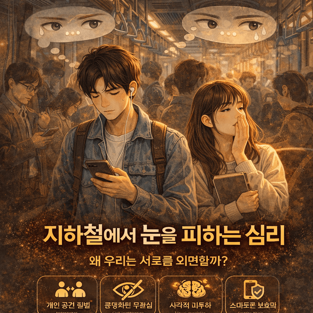 지하철에서 눈을 피하는 행동의 심리: 왜 우리는 서로를 외면할까?만원 지하철 안, 바로 앞에 서 있는 사람과 눈이 마주칠 뻔한 순간 급하게 스마트폰으로 시선을 돌린 적이 있으신가요? 아마 현대인이라면 누구나 하루에도 몇 번씩 겪는 일일 것입니다. 좁은 공간에 수많은 사람이 밀집해 있지만, 그 어느 곳보다 정막하고 개인적인 이 공간에서 '시선'은 매우 민감한 요소입니다.저도 예전에 퇴근길 지하철에서 실수로 앞사람과 정면으로 눈이 마주쳤을 때, 순간적으로 당황해서 있지도 않은 휴대폰 알림을 확인하는 척했던 기억이 나네요. 여러분은 어떠신가요? 비슷한 경험이 있으시죠? 오늘은 우리가 왜 유독 지하철에서 타인의 시선을 피하는지, 그 속에 숨겨진 복잡한 심리학적 이유를 깊이 있게 파헤쳐 보겠습니다.1. 개인 공간..