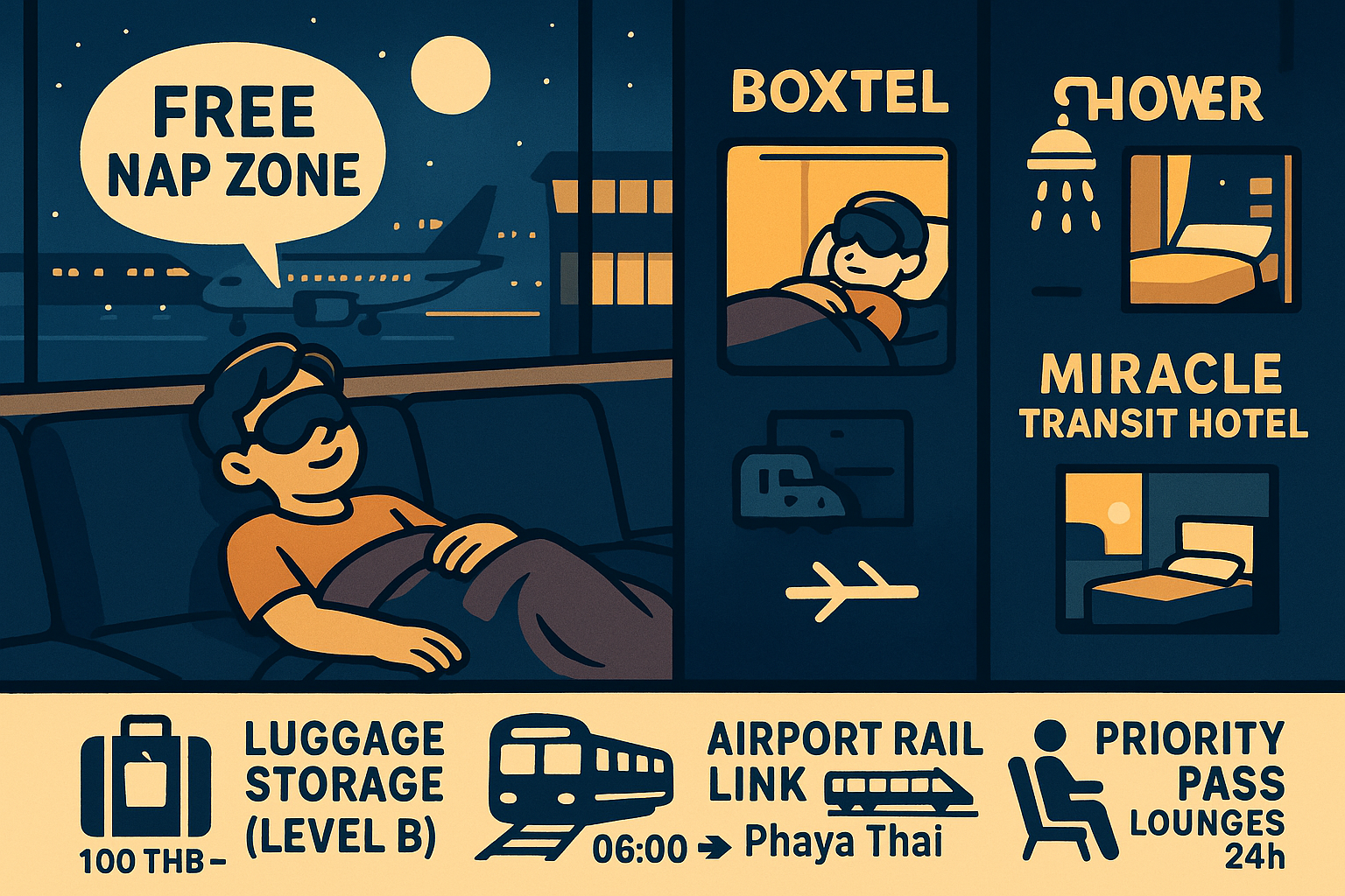 | Miracle Transit Hotel | 6시간 약 2,500바트~ | 에어사이드 호텔, 샤워·침대 제공 | 환승객, 프라이버시 중시 |