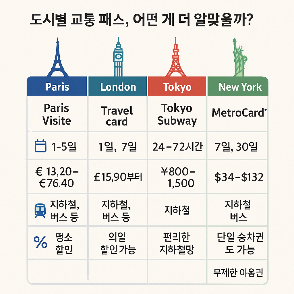 항공권과 숙소만큼 중요한 게 교통비 절약입니다. 단순히 매번 티켓을 끊는 것보다, 현지 교통 패스를 이용하면: