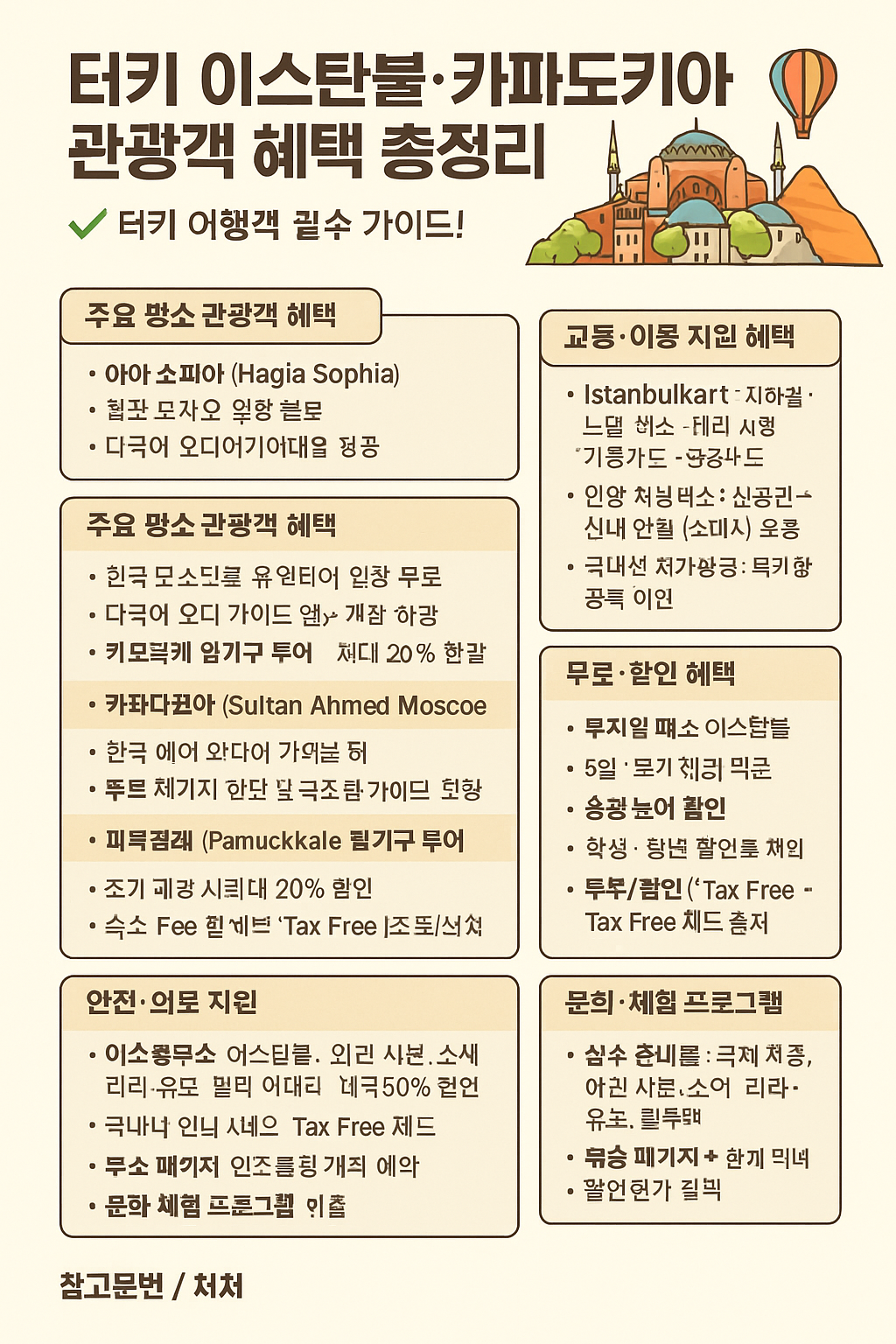 터키 여행을 계획하는 분들이라면 꼭 알아야 할 것이 있습니다. 바로 관광객을 위한 혜택입니다. 터키는 이스탄불의 역사적 유적지, 카파도키아의 열기구, 파묵칼레의 온천과 같은 세계적인 명소뿐 아니라, 여행객이 더 편리하게 체험할 수 있도록 교통, 할인, 무료 입장, 안전 지원 등 다양한 프로그램을 제공합니다. 이 글에서는 실제 여행자들이 꼭 알아두면 좋은 지원 혜택을 100% 활용할 수 있는 방법을 정리했습니다.