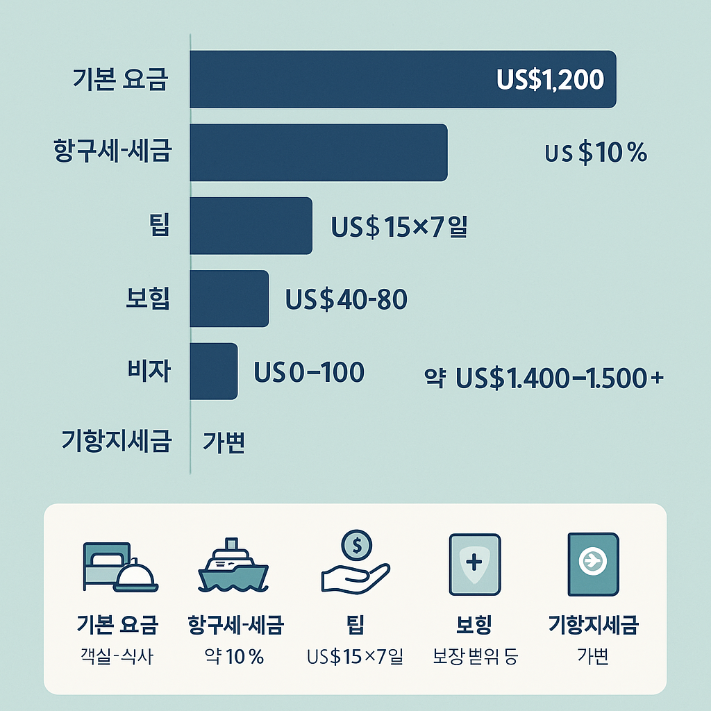 2025 글로벌 크루즈 여행 필수 팁 – 승선세·팁·보험·비자·기항지 세금까지 계산하기 정보 제공용 · 티스토리·AdSense 정책 준수(과장/수익보장 없음) 크루즈 요금엔 객실·식사 등이 포함되지만, 항구세(승선세), 팁, 여행자 보험, 비자, 기항지 세금은 별도인 경우가 많습니다. 아래 가이드는 2025년 기준 공개 정책을 토대로, 누락 없이 예산을 세우도록 돕습니다. 목차 크루즈 비용 구조 한눈에 승선세·항구세 이해하기 팁(Gratuities) 정책 여행자 보험(의료·후송 포함) 비자·출입국 요건 기항지 세금·관세 예산 계산 예시 & 체크리스트 FAQ 참고문헌/출처 크루즈 여행, 기본요금만 봐선 안 돼요 — 숨은 추가비용 한눈에 보기 크루즈 비용 구조 한눈에 기본 포함 객실, 기본 식사(메인 다이닝/뷔페), 일부 쇼/엔터 기본 선상 시설(수영장·헬스장 등) 추가 발생 항구세/세금(Port Fees & Taxes) 팁(자동 청구되는 경우 다수) 여행자 보험(의료·응급후송·취소/지연) 비자/전자여행허가(예: ESTA, eTA 등) 기항지 관광·쇼핑 세금/관세, 선택 액티비티 예약서/인보이스의 “Taxes & Fees 포함 여부”를 꼭 확인하세요. 항구가 많을수록 추가 비용이 커집니다. 승선세·항구세 이해하기 항만 사용, 보안, 검사, 하역 등에 대한 비용으로, 노선·항구·선사별로 금액이 다릅니다. 보통 요금에 포함되거나 별도 항목으로 청구됩니다. 선사 FAQ/요금안내에서 항만세·세금 항목을 확인(예: 항차별 상이). 대서양/카리브/알래스카/지중해 등 지역·항만마다 차이 큼. 팁: 동일 일정이라도 출발/도착 항만이 바뀌면 총 세금이 달라질 수 있습니다. 팁(Gratuities) 정책 대부분 선사는 객실·다이닝 스태프 팁을 일 인당 일일 요금으로 자동 청구합니다. 일반 범위는 약 US$12~20+/일(선사·등급별 상이). 일부 선사는 팁 포함 가격을 판매합니다. 음료·스파·스페셜티 다이닝은 별도 서비스료가 붙는 경우 多 현금 추가 팁은 자율(정책 확인) 여행자 보험(의료·후송 포함) 선상 진료·해상 응급후송 비용은 매우 비쌀 수 있어 크루즈 특약 포함 종합 보험이 권장됩니다. 의료비, 응급후송, 여행 취소/지연, 수하물 보장 포함 여부 확인 항해 전 기간+모든 기항지에 적용되는지 확인 일부 선사는 보험을 권고/요구하며, 커버 범위를 제한하기도 합니다. 증권 약관을 꼼꼼히 확인하세요. 비자·출입국 요건 기항지 국가마다 비자/전자허가/무비자 기준이 다릅니다. 시작·종료 항구가 다른 오픈조 단일항해의 경우 규정이 달라질 수 있어 주의하세요. 여권 유효기간: 통상 승선일 기준 6개월 이상 권장 국적별 면제·현장 비자 등 예외 많음 → 공식 공지로 재확인 기항지 세금·관세 기항지 쇼핑에는 현지 부가세(VAT/GST/세일즈택스)가 적용될 수 있고, 자국 입국 시 면세 한도 초과분은 관세 대상입니다. 국가별 면세 한도·신고 의무 확인 알코올·담배·고가품 구입 시 한도 초과 주의 7박 크루즈 예산 구성 한눈에 보기 예산 계산 예시 & 체크리스트 예시: 7박 8일(미국 출발, 기항지 3곳) 항목 추정 비용 메모 기본 요금(객실·식사 등) US$1,200 선실/시즌에 따라 변동 항구세·세금 약 10% → US$120 항구·항차별 상이 팁(US$15×7일) US$105 선사·등급에 따라 상이 여행자 보험 US$40~80 보장범위·연령에 따라 비자/전자허가 US$0~100 국가·국적별 상이 기항지 세금/관세 가변 구매·면세한도에 따라 예상 합계 약 US$1,400~1,500+ 체크리스트 ✅ 예약서의 Taxes & Fees 포함 여부 확인 팁 정책·일일 금액·자동 청구 여부 확인 보험: 의료·응급후송·취소 보장 포함/기간 일치 비자/전자허가: 기항지·출입국 모두 확인 면세 한도·기항지 세율 사전 확인 여권 유효기간(6개월+), 비상연락·약/처방 준비 FAQ 항구세는 선택인가요? 대부분 필수이며 요금에 포함되거나 별도로 청구됩니다. 팁은 얼마를 잡아야 하나요? 대체로 1인당 일일 US$12~20+ 범위가 일반적입니다. 선사 공지를 확인하세요. 보험은 반드시 필요할까요? 선상 의료·후송비가 높아 크루즈 특약 포함 종합 보험이 강력 권장됩니다. 비자는 승선항만 기준만 보면 되나요? 아니요. 모든 기항지와 종료 항구까지 각 요건을 확인해야 합니다. 기항지 쇼핑 시 세금은? 현지 VAT/GST가 적용될 수 있고, 귀국 시 면세 한도 초과분은 관세 대상입니다. 참고문헌 / 출처 Royal Caribbean – Taxes, Fees & Port Expenses 안내(선사별 항목 확인 권장) CruiseNation – Port Fees & Taxes 개요(항만세 구조 설명) AAA(Cruising 101) – 팁 정책·선상 비용 가이드 Princess Cruises – Pre-Cruise FAQ(보험·의료 관련 안내) Travel.State.Gov – 크루즈 여권/안전/입국 관련 일반 지침 본 글은 2025년 기준 공개 자료를 바탕으로 작성한 정보 제공용 콘텐츠입니다. 실제 예약·승선 전에는 이용 선사와 각 기항지 정부의 최신 공지를 반드시 확인하세요.